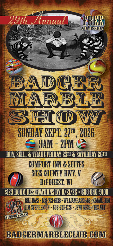 Yea.. adults talking ‘marbles’, just as they did as children and hoping to lure a few others yearning for some nostalgia. See some of Americas greatest marbles and collections. All kinds of stuff. Rooms are open all day Fri. & Sat. for you to browse and ask questions. If you played marbles as a kid, you will love the Badger Marble Show.